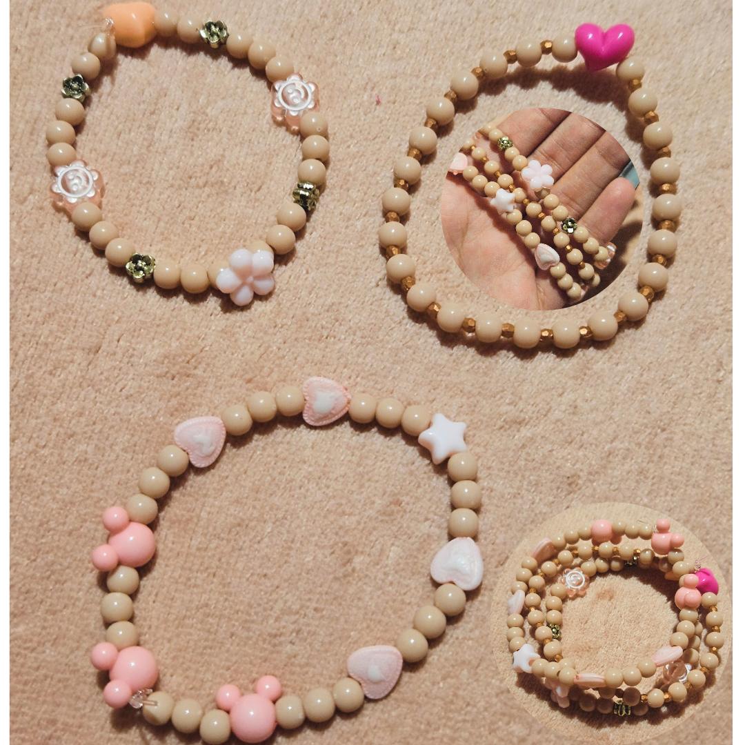 Três unidades da pulseira de miçangas cor nude.